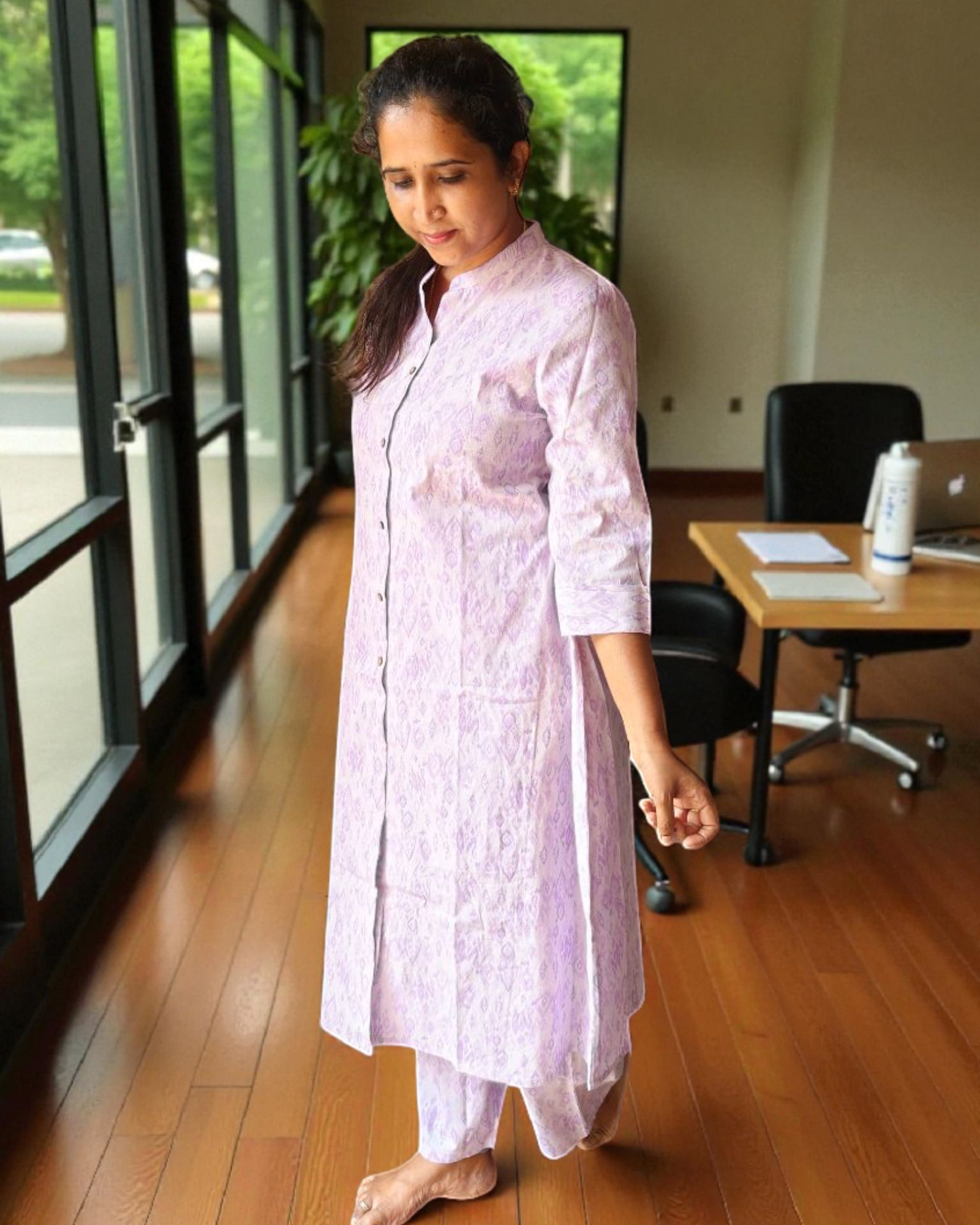 Elevate your office wardrobe with this premium Kora cotton co-ord set, expertly designed for all-day comfort and professional elegance. The A-line kurta features a refined close collar neck that adds sophistication, while the straight-cut pants provide a polished silhouette. Crafted from breathable Kora cotton, this set ensures you stay cool and comfortable throughout your workday. Perfect for those who value quality fabrics and timeless style in their professional attire.